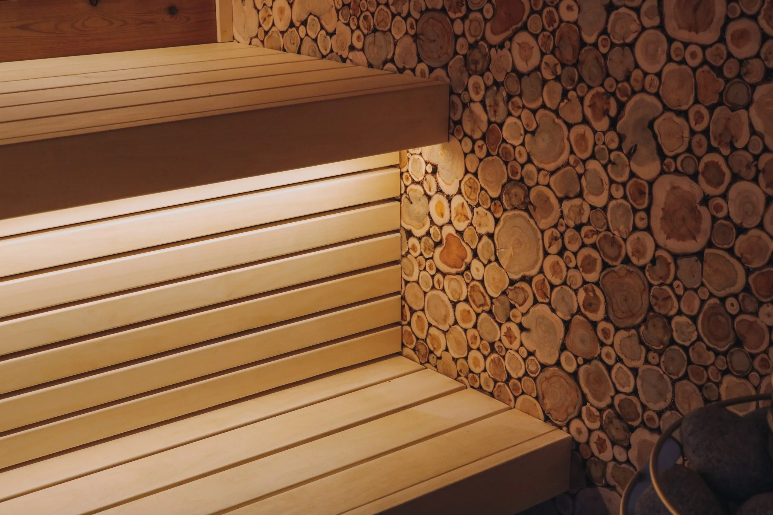 >Les cabines sauna avec poêle sous banquettes