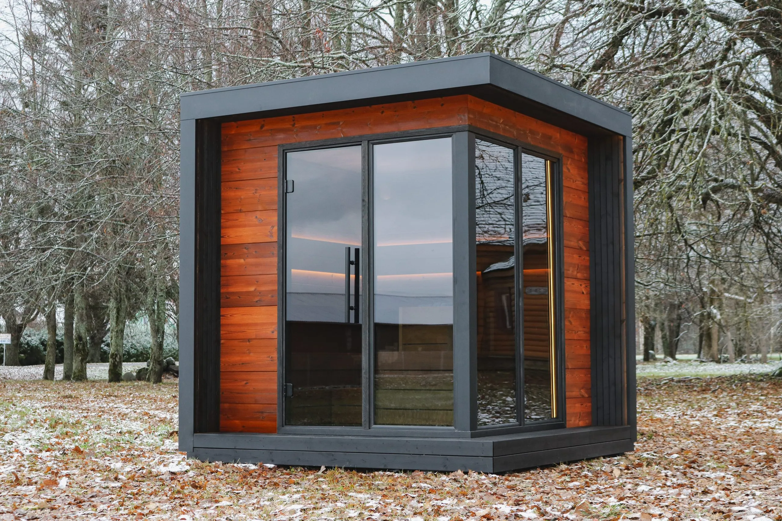 Équipée de deux banquettes et d’une baie vitrée d’angle, la cabine sauna Boden Mini représente le choix idéal pour ceux qui ne veulent faire aucun compromis entre design et praticité, ce qui en fait le produit idéal pour les espaces restreints.