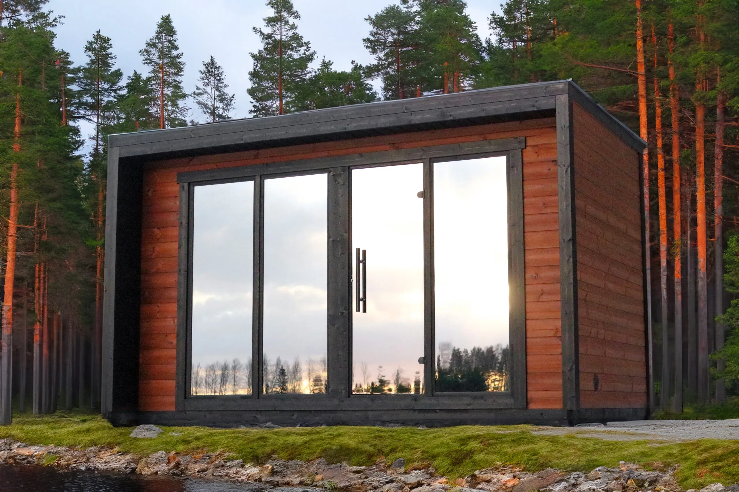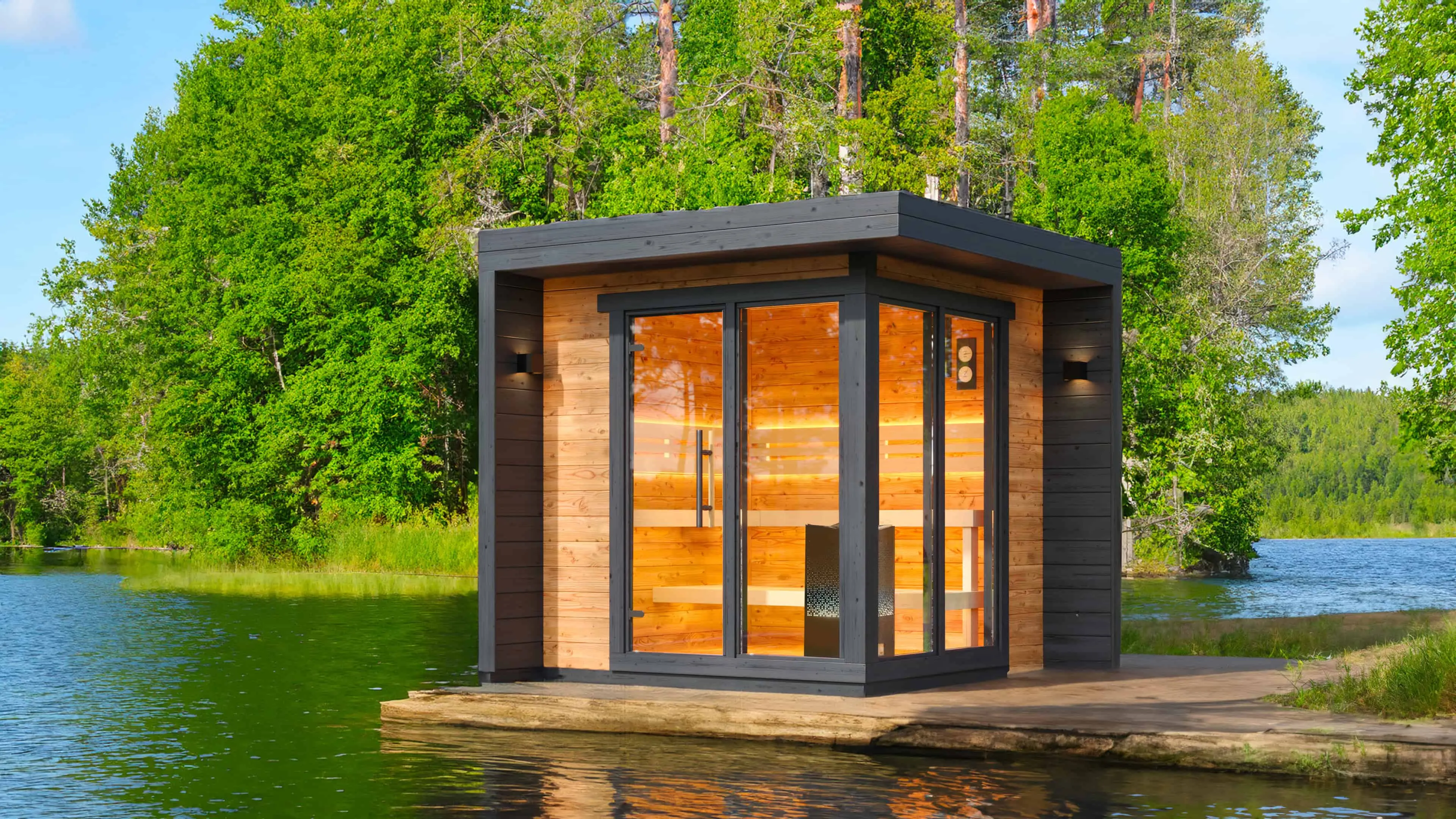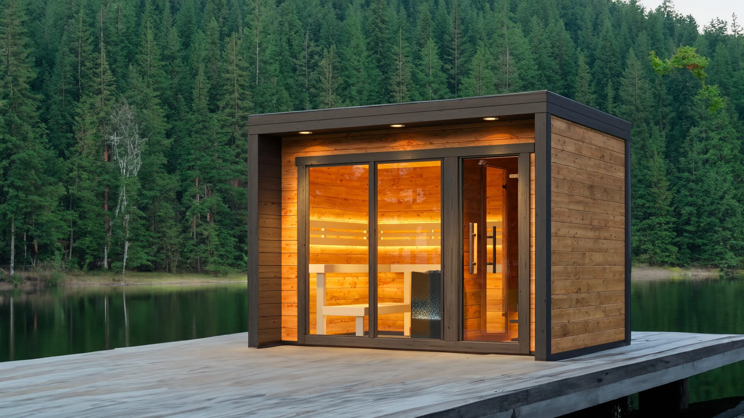 Il est équipé de deux banquettes (dont une d’angle) et d’une large baie vitrée d’angle qui vous donnera l’impression de vous trouver en extérieur. La cabine est également dotée d’un poêle Tylö de 10kW qui vous permettra d’obtenir rapidement une température optimale et homogène dans l’ensemble de la cabine.