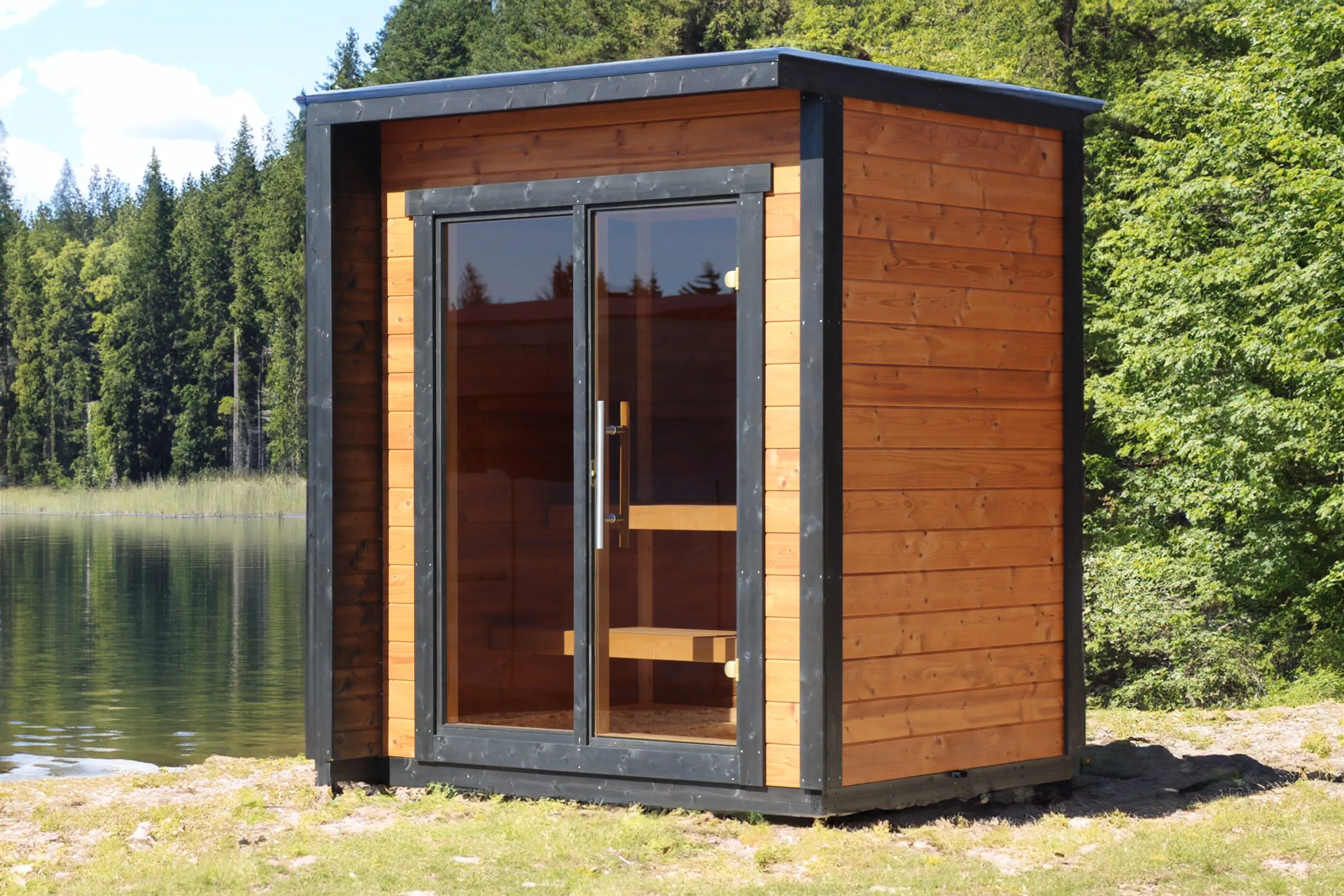 Le sauna d’extérieur Gotland S accueille confortablement jusqu’à 4 personnes.
