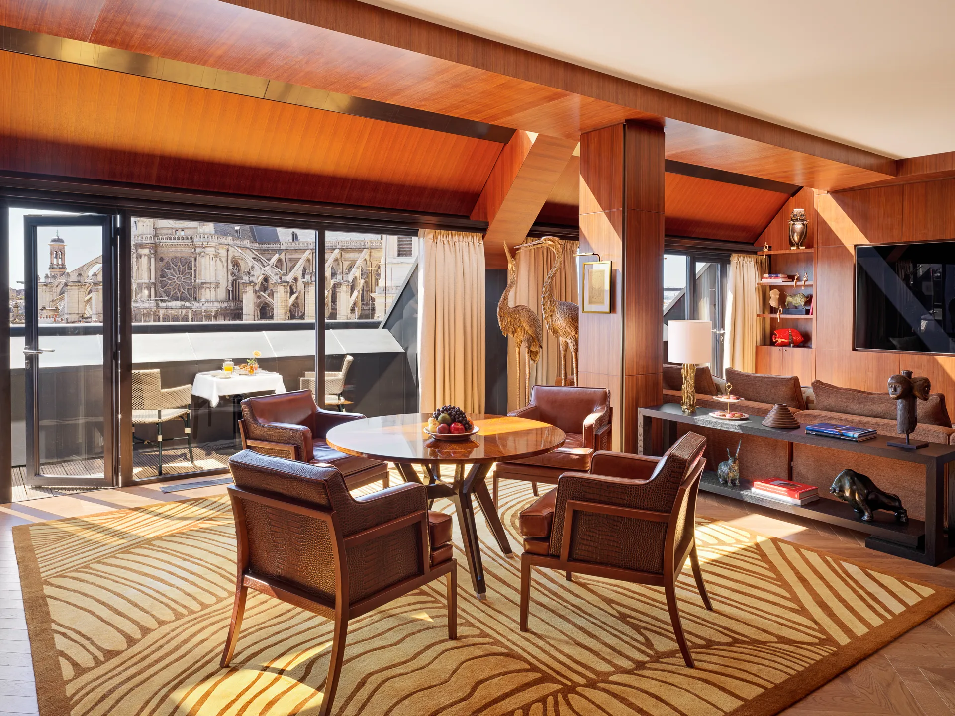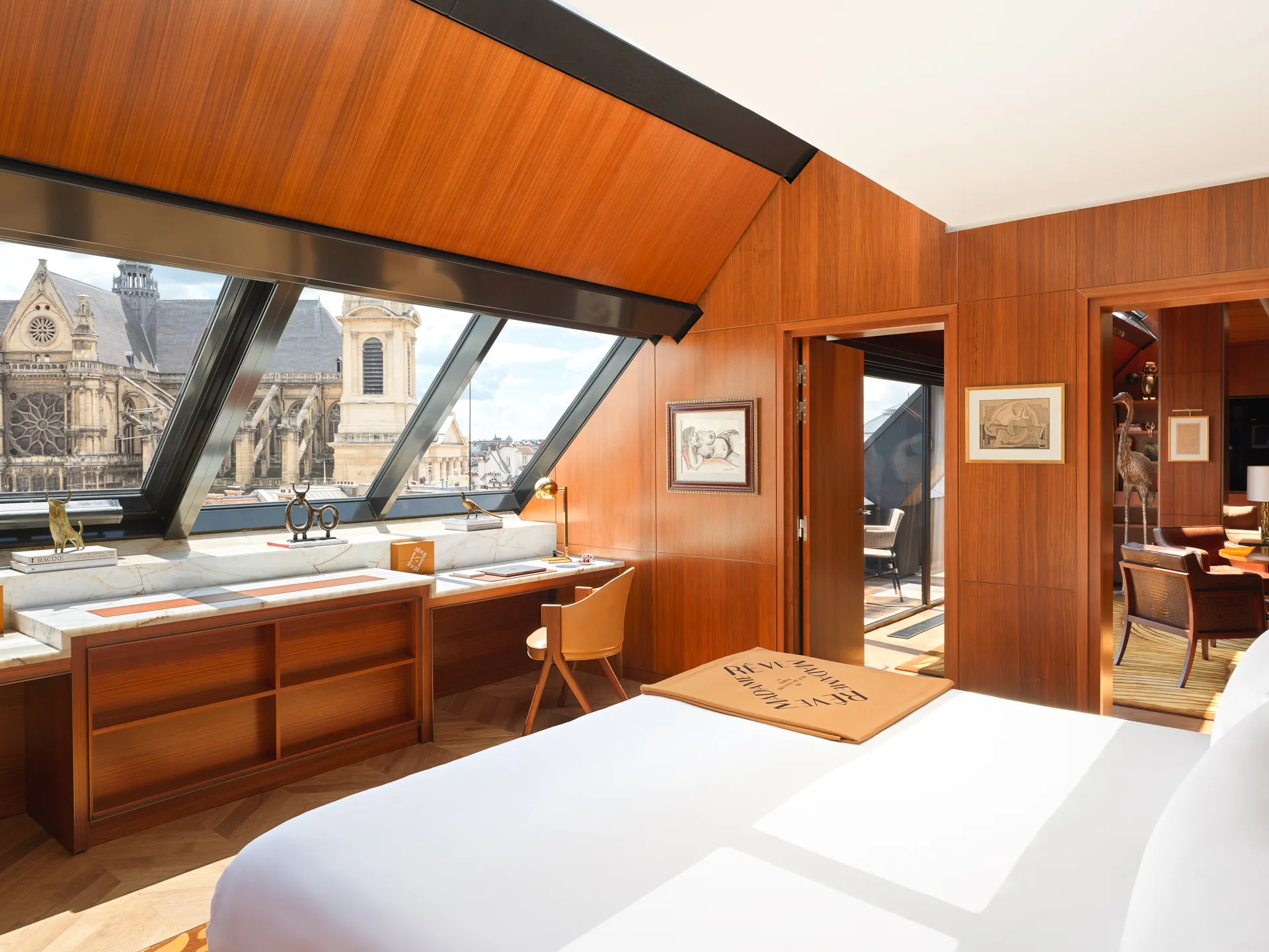 Ce Penthouse de 130 m² a été pensé comme un appartement parisien perché au-dessus de la ville. Un lieu libre, à moduler selon l’envie, où la lumière circule et les perspectives s’ouvrent : le Centre Pompidou, l’église Saint-Eustache, le Panthéon… autant de totems qui dessinent l’horizon.
